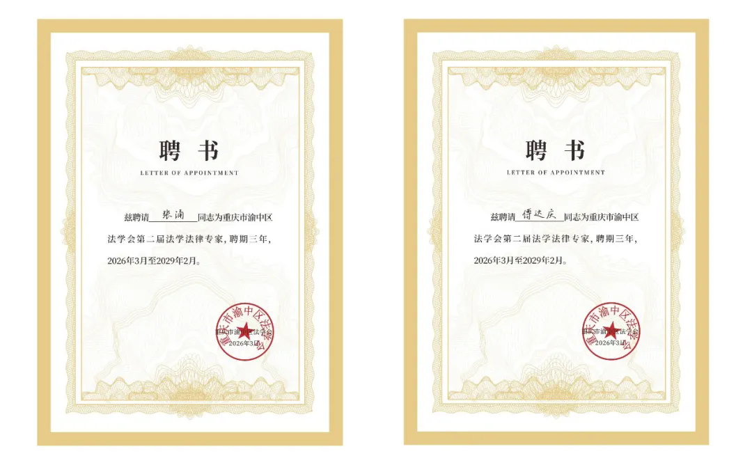 资深合伙人张涌、傅达庆获聘渝中区法学会法学法律专家丨中豪荣誉